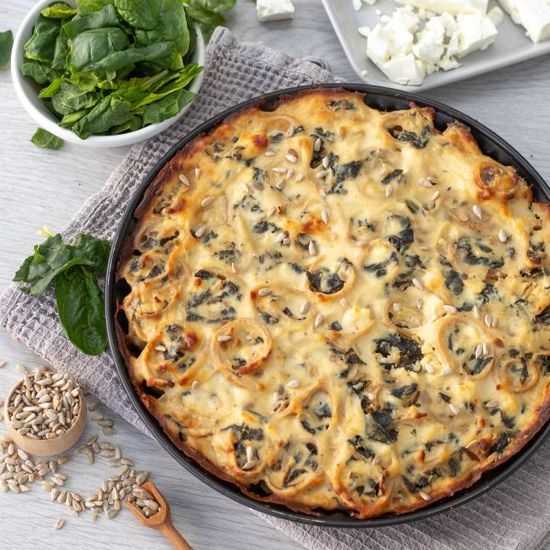 Mehl, Milch und eine Prise Salz zu einem glatten Teig rühren und zunächst ruhen lassen. Spinat waschen, putzen und klein zupfen, Stiele ggf. mitverwenden. Zwiebeln und Knoblauchzehen schälen und fein hacken. Die Sonnenblumenkerne in einer beschichteten Pfanne für ca. 5 Minuten goldbraun rösten.