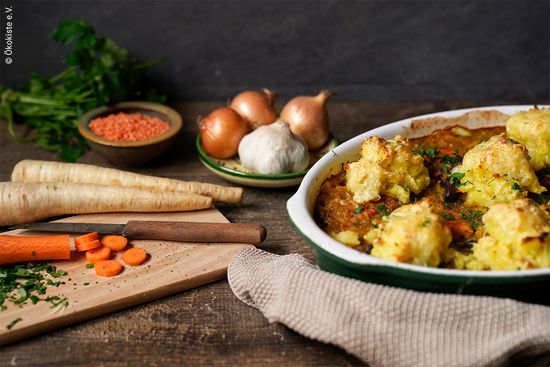 • In der Zwischenzeit Kartoffeln schälen, grob würfeln und in kochendem Salzwasser weich kochen. Mit Milch und Butter pürieren und mit Salz und Pfeffer würzen. Die Form aus dem Ofen nehmen und vorsichtig löffelweise Kartoffelpüree auf das Gemüse geben. Den Backofen auf 180°C erhöhen, den Auflauf wieder in den Ofen stellen und weitere ca. 20 min. backen, bis die Kartoffelwölkchen knusprig werden.