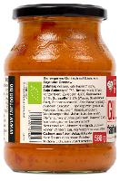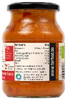 Wasser, rote Paprika* 8,5%, Soja-Schnetzel* 7%, Tomatenmark* 2-fach konzentriert, Zwiebeln* 4,3%, Cashewmus* 3,4%, Sojasoße* 2,2% (Wasser, Sojabohnen*, Salz), Sonnenblumenöl*, Salz, Balsamicoessig*, Zwiebeln geröstet*, Paprikapulver* geräuchert, Kokosblütenzucker*, Knoblauchpulver*, Verdickungsmittel: Johannisbrotkernmehl*, Pfeffer schwarz*, Kreuzkümmel*, Majoran*, Chili*.